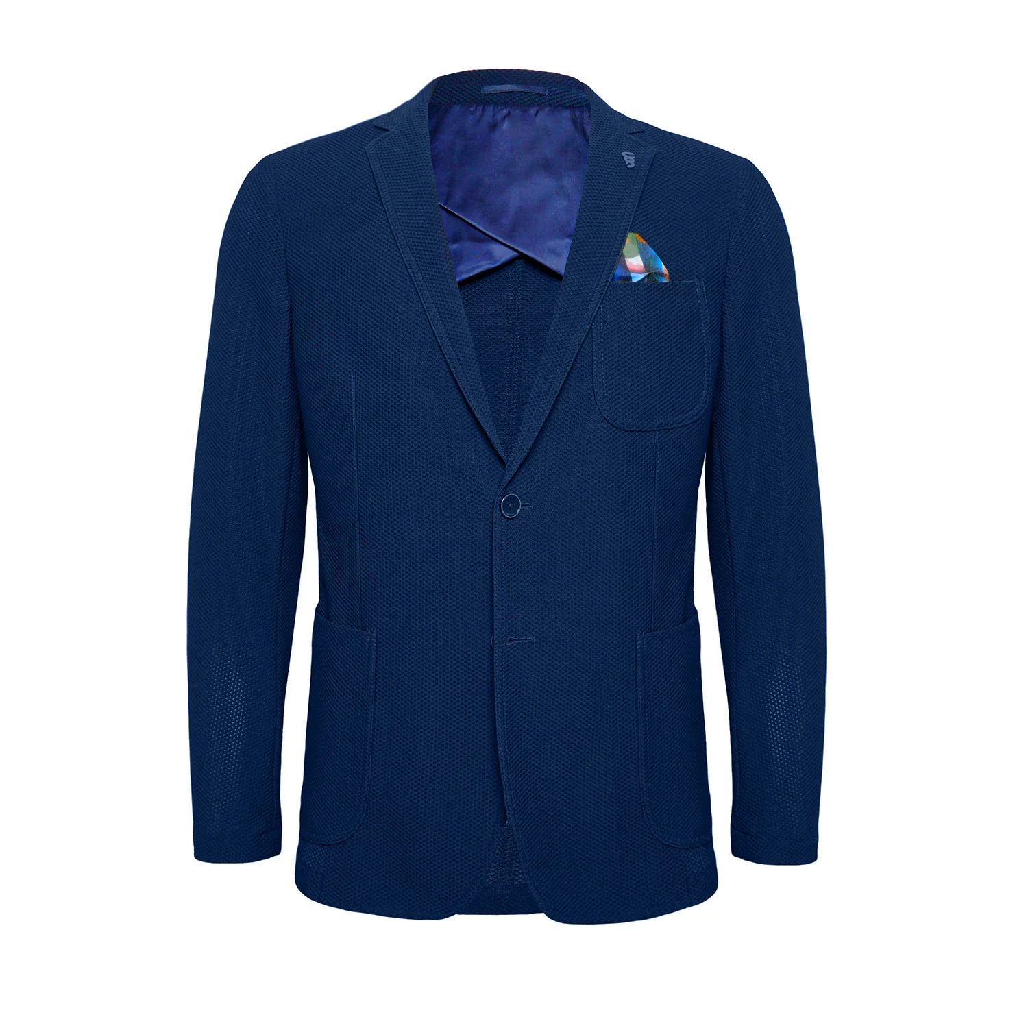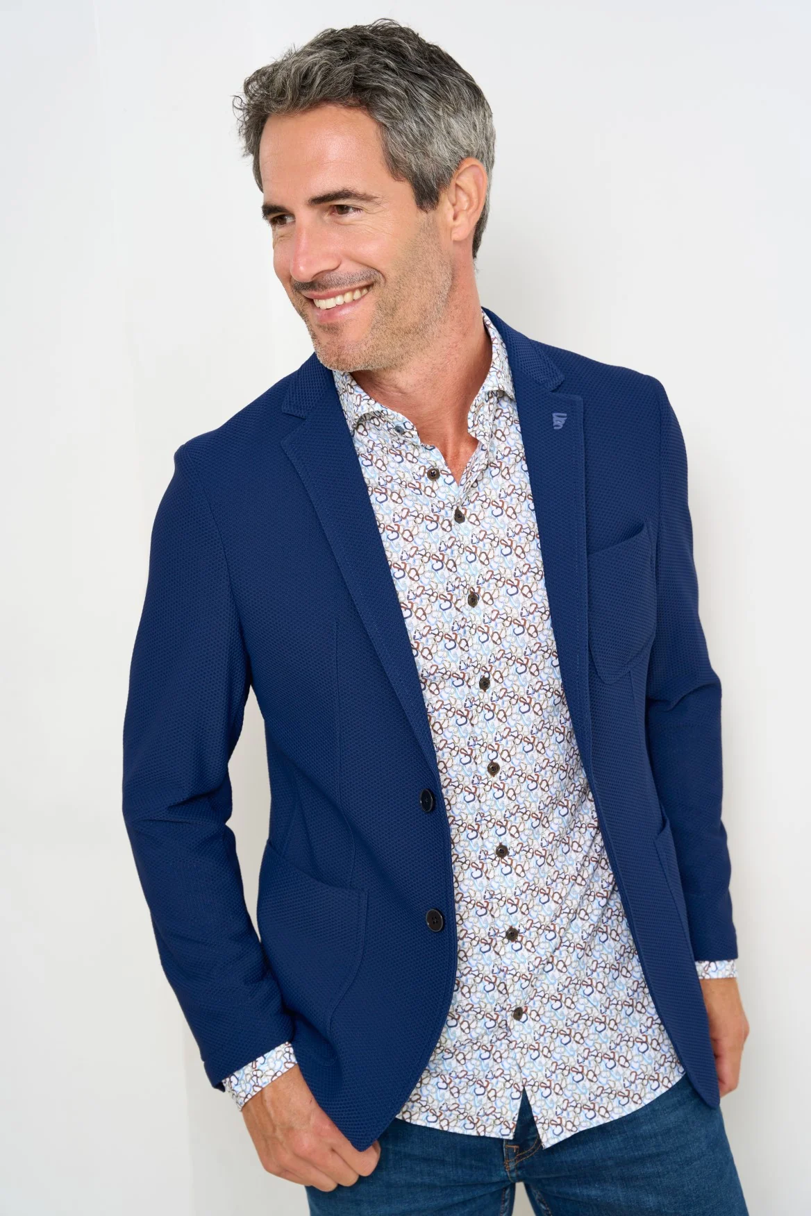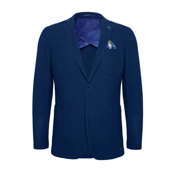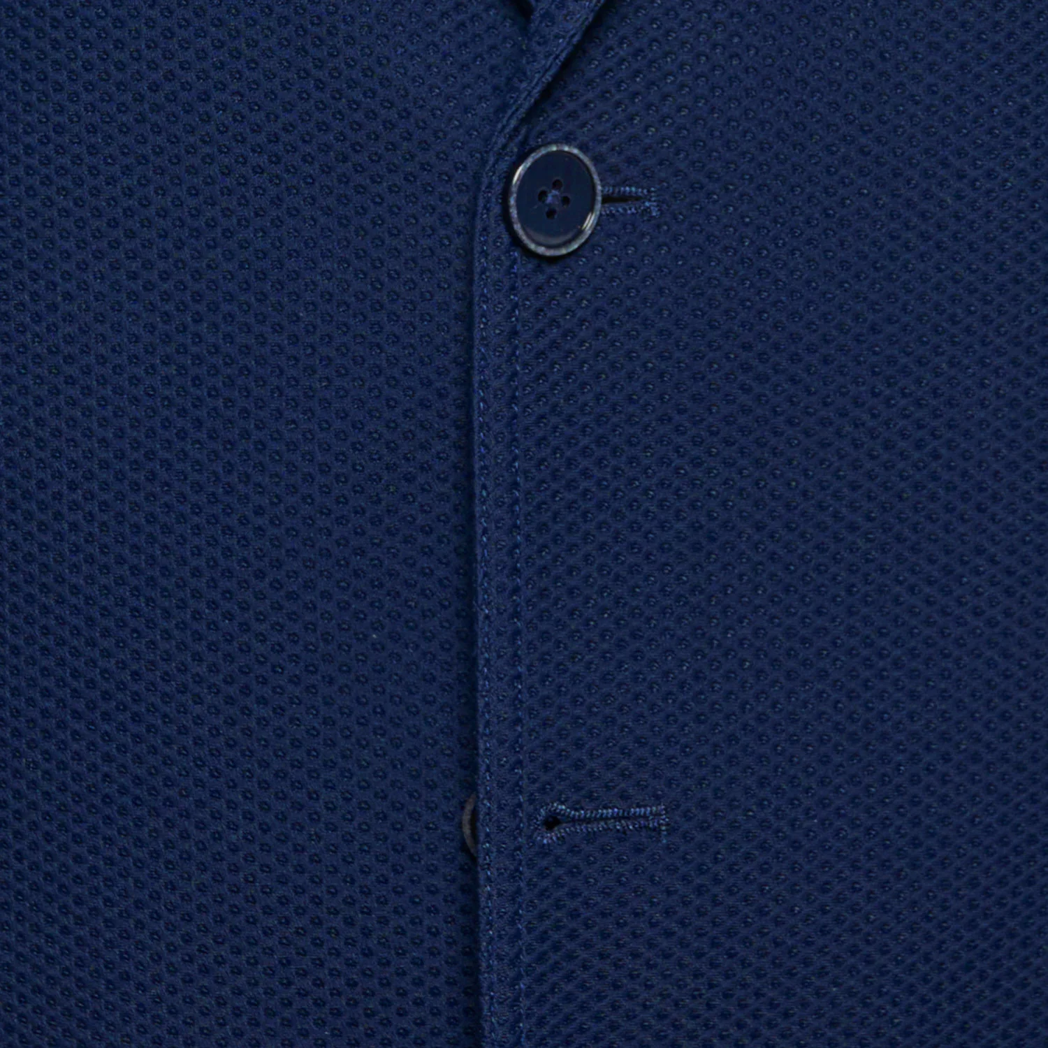 The technical material combines a clean, tailored look with the ease of a travel piece, making it comfortable to wear throughout the day.